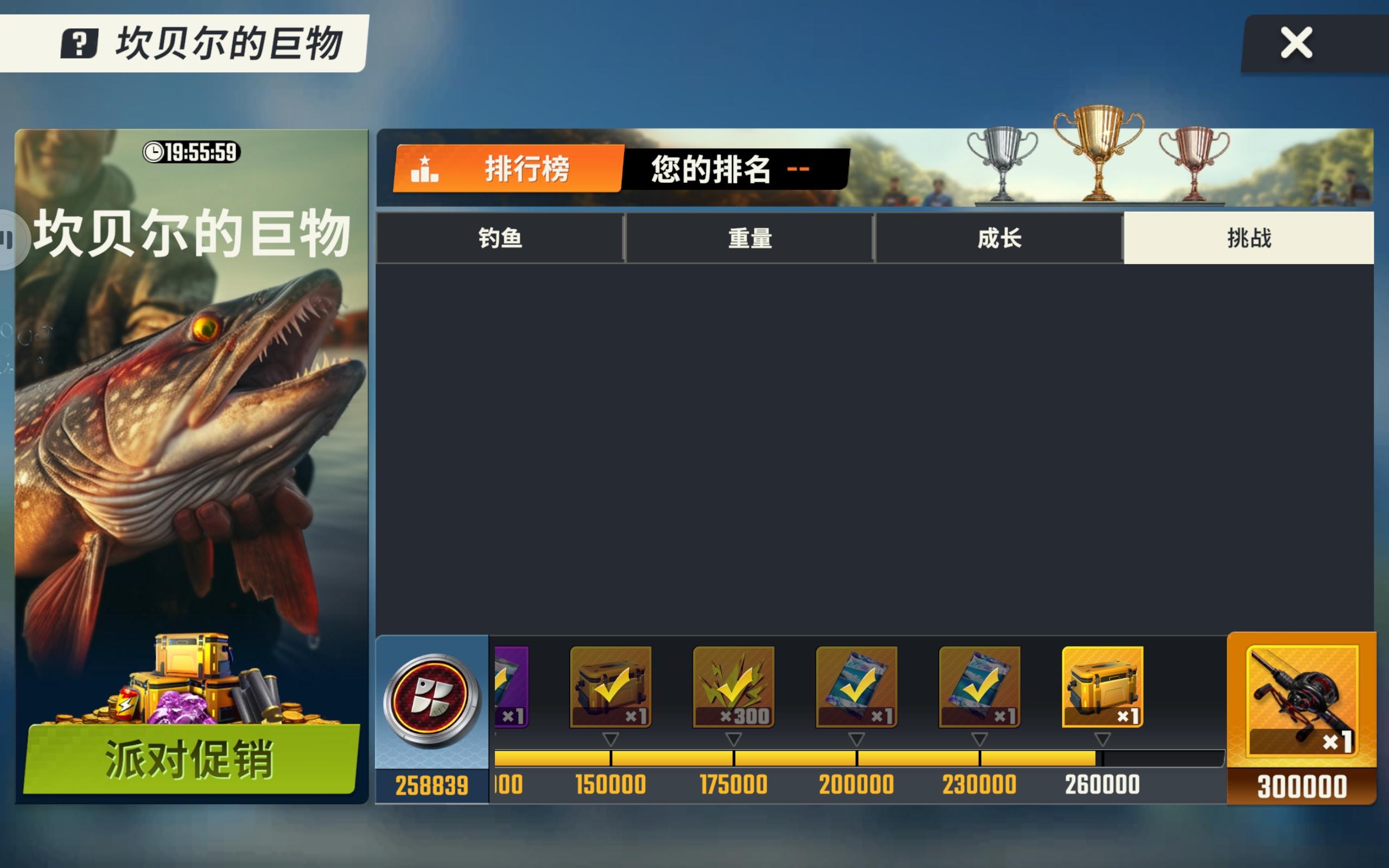 早上上线的时候好像领了这个坎贝尔的巨物结算奖励,刚刚再上才发现还有二十小时,宝箱和鱼竿都没钓够分,但任务已经不刷新了,排行榜也固定了