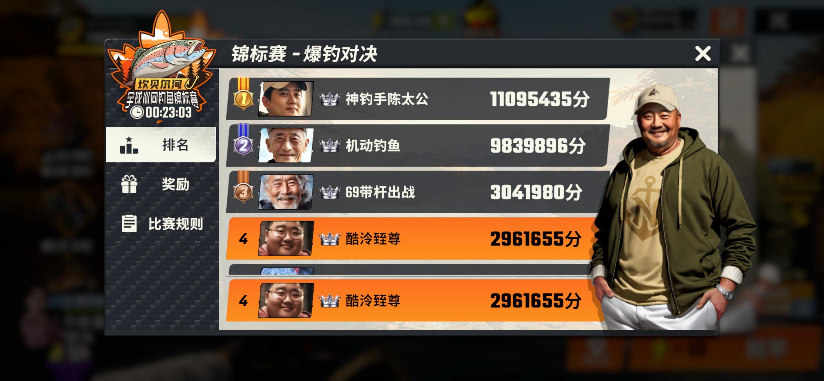 2点半的时候,第一名还是机动钓鱼,神钓手陈太公都不在榜上,3点半一看,第一名瞬间变成神钓手陈太公了。
