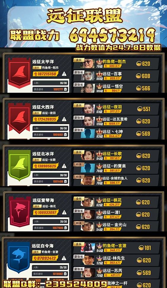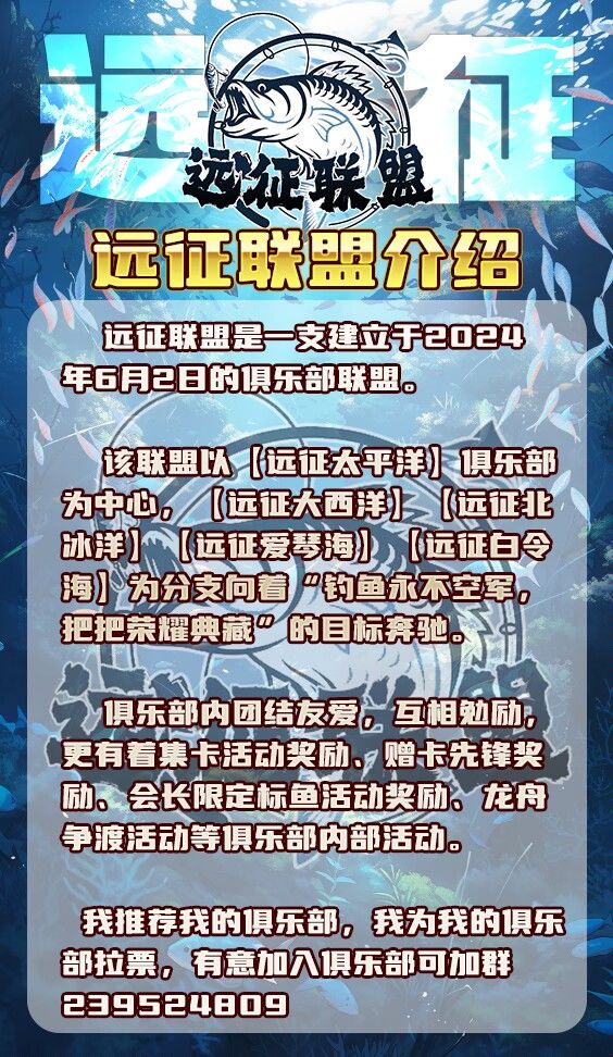 远征海钓俱乐部招人啦!!!找俱乐部,死人太多,活人太少,公会活动摸鱼的太多,公会没福利,想跳槽 ✨每期集卡活动均有红包奖励,还有每月赠卡先锋奖励、不定时标鱼奖励等你来拿✨远征俱乐部联盟五个俱乐部,总有一个适合你,喜欢玩俱乐部,公会模式的速来✨群号:239524809✨加群了解详情!!!#欢乐钓鱼大师最强俱乐部