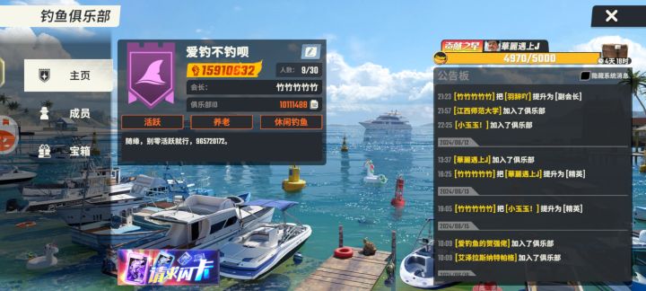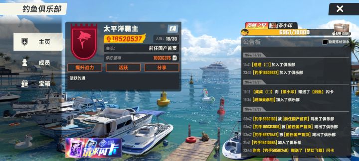 远征海钓俱乐部招人啦!!!找俱乐部,死人太多,活人太少,公会活动摸鱼的太多,公会没福利,想跳槽 ✨远征俱乐部联盟五个俱乐部,总有一个适合你,喜欢玩俱乐部,公会模式的速来✨新加入成员要求 平均单日消耗体力 4000以上 并接受改名要求✨⚓远征太平洋⚓ 要求战力500万以上🆔10012777 要求周贡献3500+🛳远征大西洋🛳 要求战力400w以上🆔10016951 要求周贡献2500+