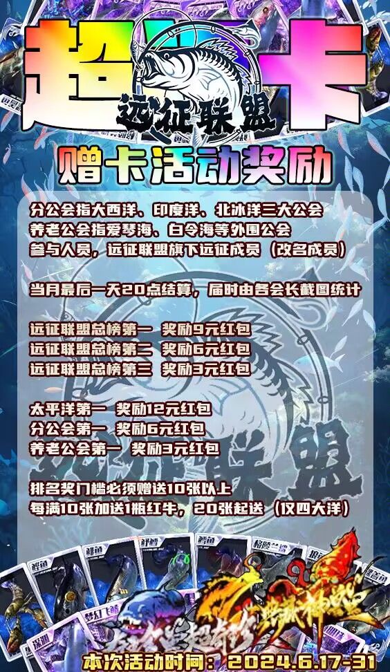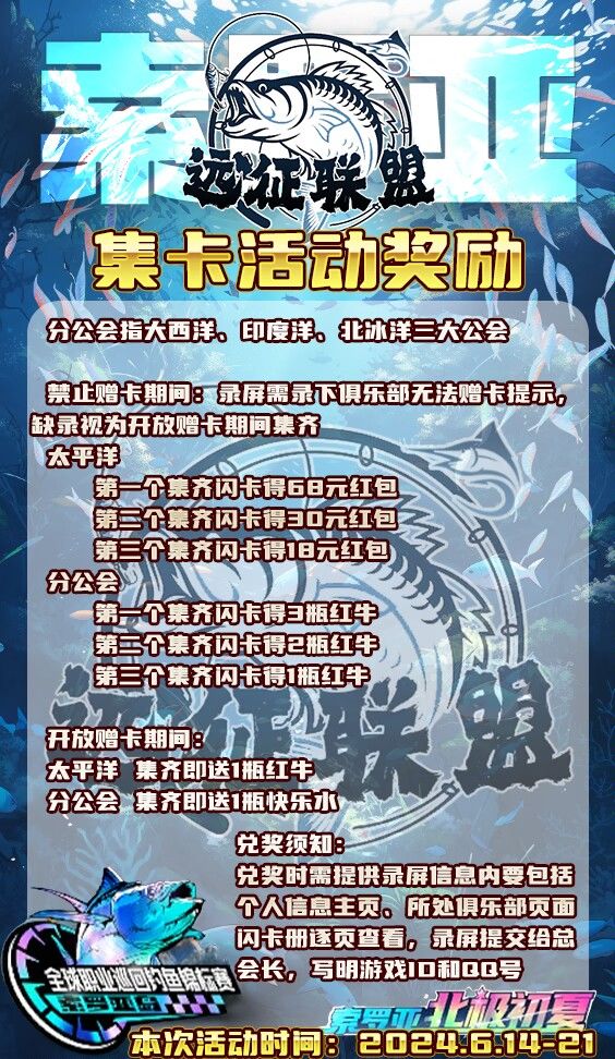 远征海钓俱乐部招人啦!!!找俱乐部,死人太多,活人太少,公会活动摸鱼的太多,公会没福利,想跳槽,远征俱乐部联盟多个俱乐部,总有一个适合你,喜欢玩俱乐部,公会模式的速来✨⚓远征太平洋⚓要求战力500w以上🆔10012777🛳远征大西洋🛳要求战力400w以上🆔10016951🛥远征北冰洋🛥要求战力300w以上🆔10011498更有多个养老公会一样有福利✨🚫超过24小时不登录会被
