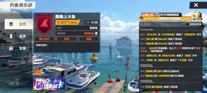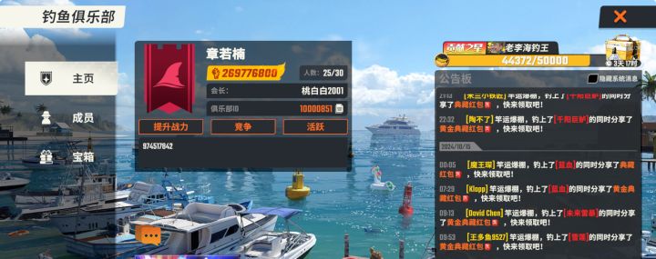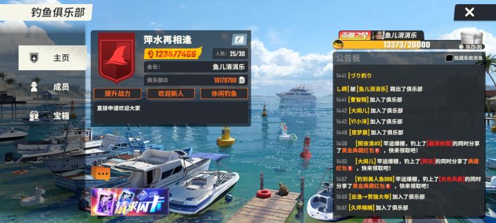 新建俱乐部:萍水再相逢,500w以上欢迎加入。俱乐部id,10178780。会长1300w战力21号龙舟竞赛大家一起happy#欢乐钓鱼大师 #欢乐钓鱼大师俱乐部