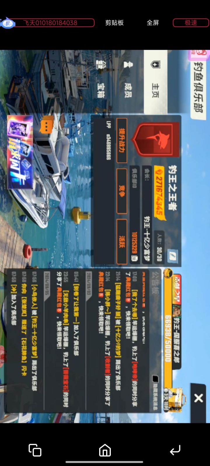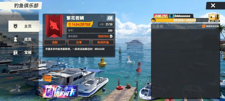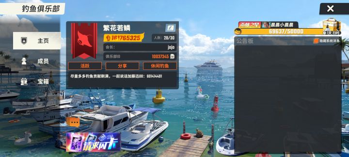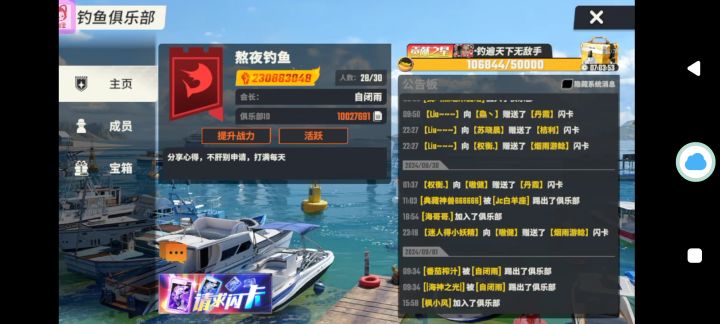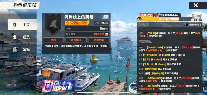 活跃俱乐部招好兄弟一起玩,活跃的,每天都能钓鱼甩几杆的,体力多的加,战力要求400w+,每周最低打1800贡献拿5w大宝箱,平时无要求,每天能上线甩几杆就行,不肝不氪,一起白嫖,俱乐部大佬免费赠送闪卡,龙舟活动每次都能保持前三,欢迎大家一起来玩,进俱乐部,先加企鹅群!!!