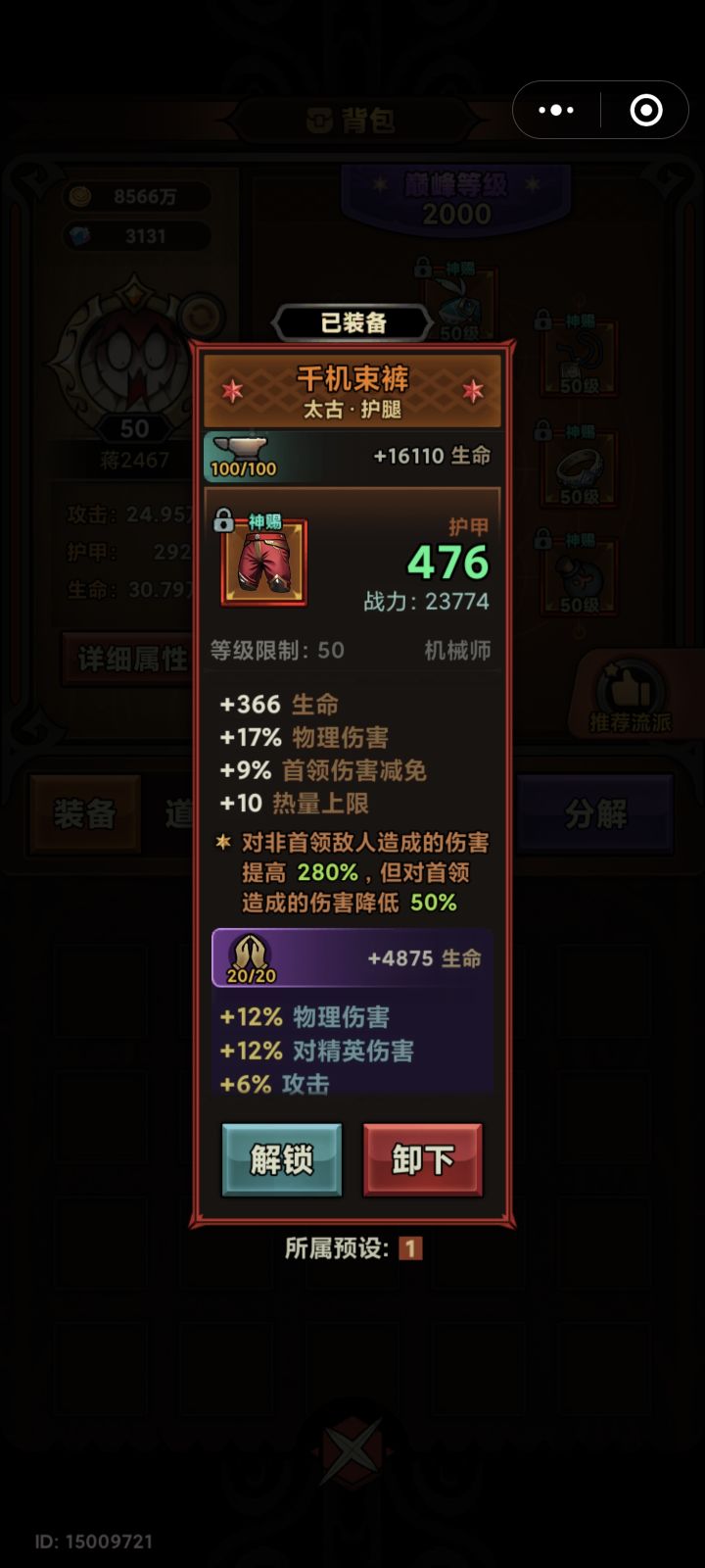 闪送快递小哥130过了就升满级了绿色套装普通的一套留一件,用来开魔眼,别背包一满就分解了#迷雾大陆 #迷雾大陆机械师