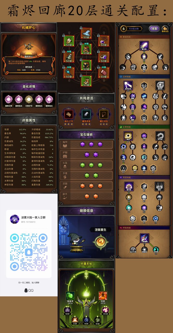 为什么今天才通关,因为没氪炽源材料,昨天才两个10级,炽源没满级的情况下暴食危机20层就不用想了。再说一下炽源天赋等级要求,霜烬至少10炼金6狂放,暴食危机要求两个技能都要满级。其实霜烬回廊通关靠的不是伤害,伤害差一点无所谓,最重要的是赌怪和赌爆炸。暴食危机就是纯靠伤害数值通关,两个天赋满级的情况下暴食用我这套配置多打几次就能通关了。有问题可以下方留言我会一一解答,欢迎加入交流群讨论游戏。