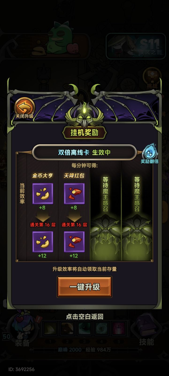 当前挂机奖励仅需每个角色每天登录3次,每次分别点开3个界面即可领满奖励,这样的领取方式过于简单,急需进一步优化-z具体建议如下:一、基础挂机奖励&拆分1、“挂机奖励”界面仅能领取[经验];2、[金币]奖励改为在“背包-道具”的新增按键中领取;3、[宝石]奖励改为在“宝石商人”的新增按键中领取;4、[传奇装备材料]奖励改为在“背包-装备”的新增按键中领取;5、[源晶]奖
