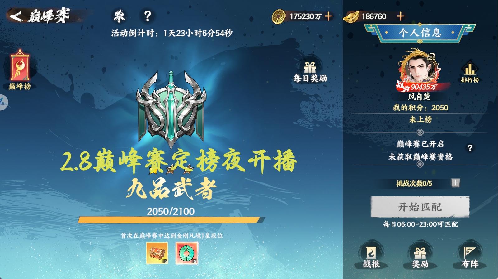 明天(2.2)少歌全部符合标准(开区时间≥30天)的服务器将开启第一届巅峰赛。本贴将以此来简单介绍下巅峰赛的内容,奖励,机制及部分推荐阵容。一、基本内容及赛程形式巅峰赛分为段位赛和巅峰赛两个赛程。①巅峰赛开启的第1天~第5天为——段位赛赛程。②巅峰赛开启的第6天~第7天为——巅峰赛赛程。*段位赛积分前64名且段位高于六品武者段位的玩家获得巅峰赛资格。*巅峰赛期间每天只有10次主动匹配次