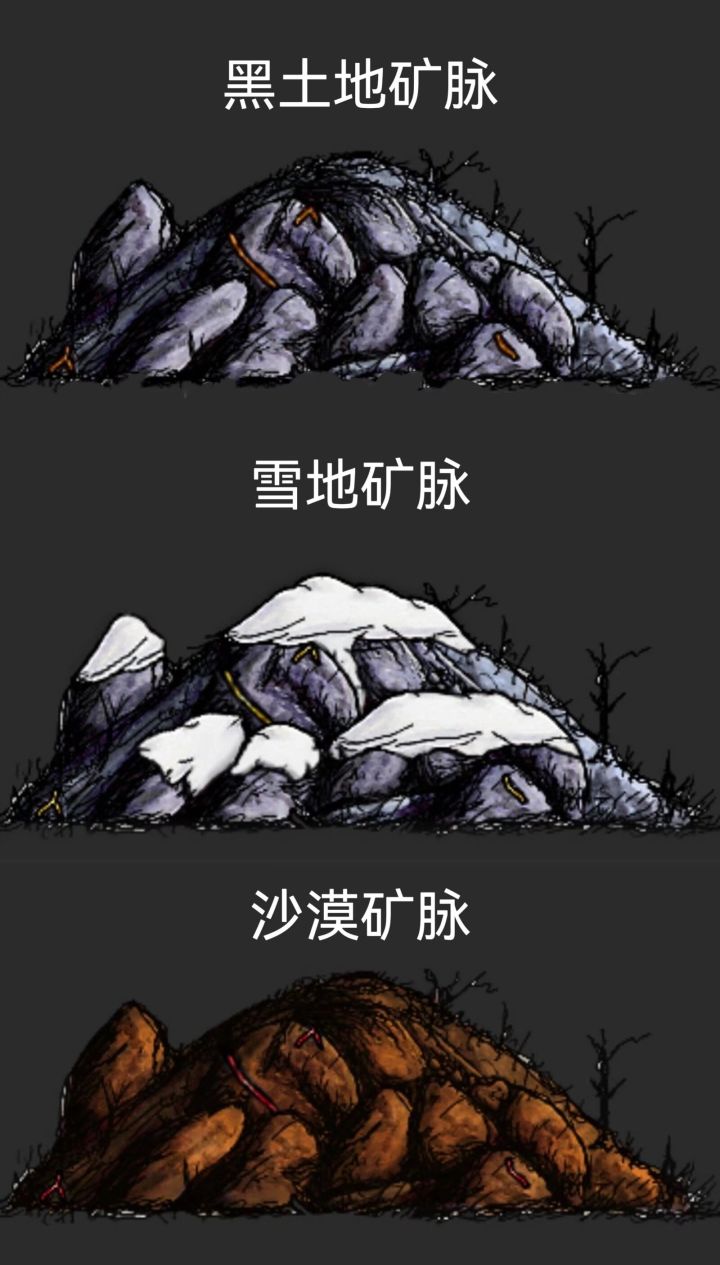 建家必备——矿脉 这个游戏是没有散铁矿石可捡的,所以前期铁矿是极其稀有的。需要用到矿脉开采铁矿石。 以下三个矿脉都可以开采到铁矿石,煤,硝石,铜矿,孔雀石,石灰。 其中雪地矿脉可以开采到稀有物——钻石💎,是这个地形特有的物品。 沙漠矿脉特有物品——铝土矿(用来做耐火砖) 不过雪地和沙漠很少能见到矿脉,大部分都是黑土地矿脉。(我还没遇见过😭) 建家时建议矿脉离出生点不要太远,还有油斑,后