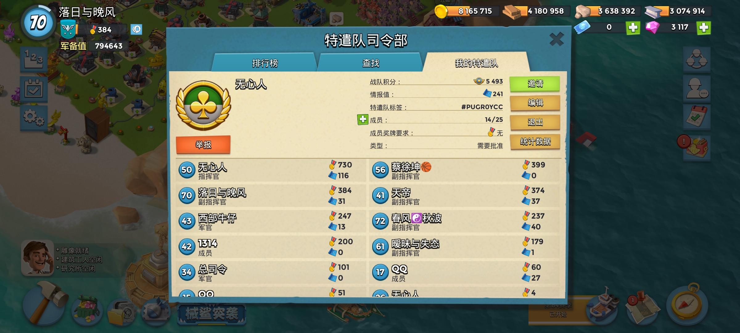 大家都是新人,开心就好,不强制,每周能打几次任务,或者能打情报都可以。欢迎常驻大佬来队伍里坐镇!#海岛奇兵