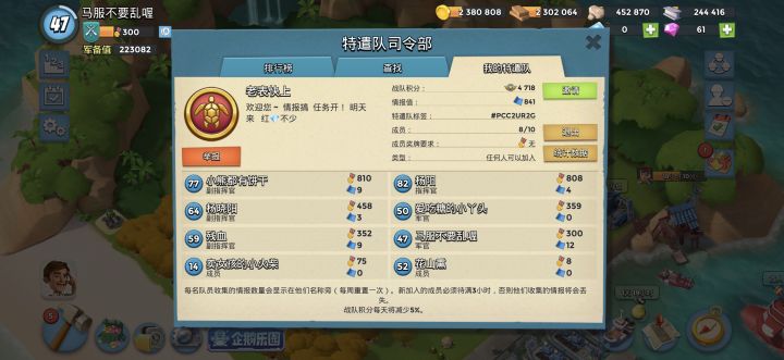 队标签:#PRL08082。日常任务开1410,每天28钻石 ,正常活跃参与任务即可。队群内节日有福利🧧#海岛奇兵
