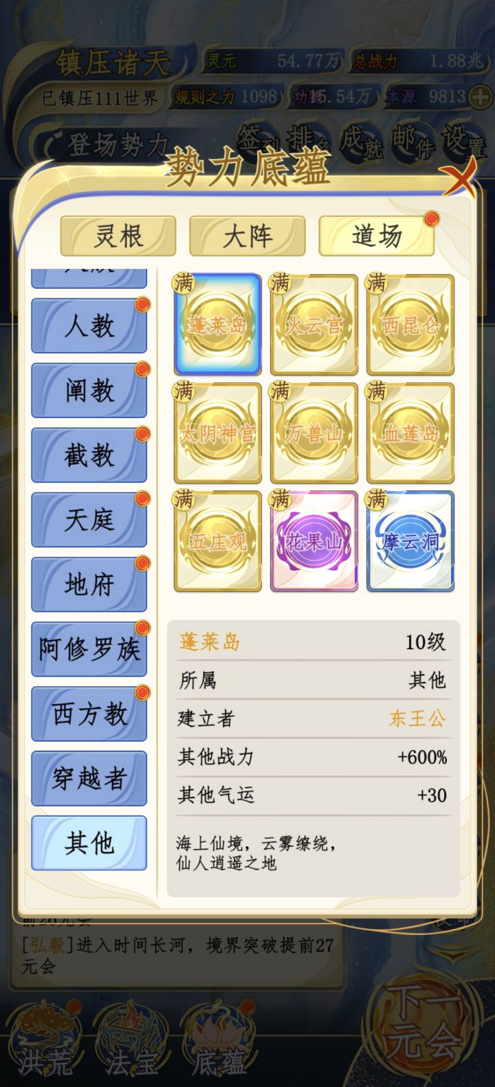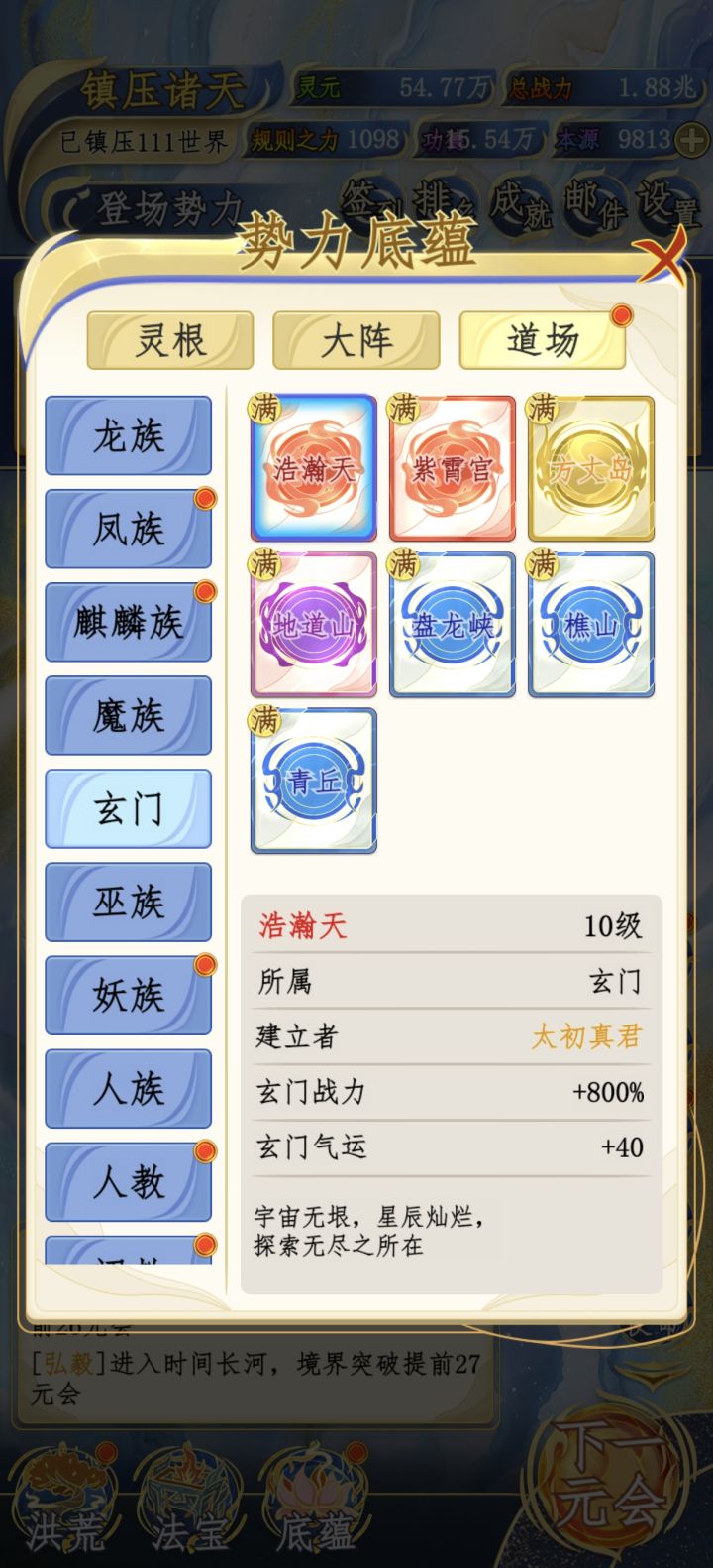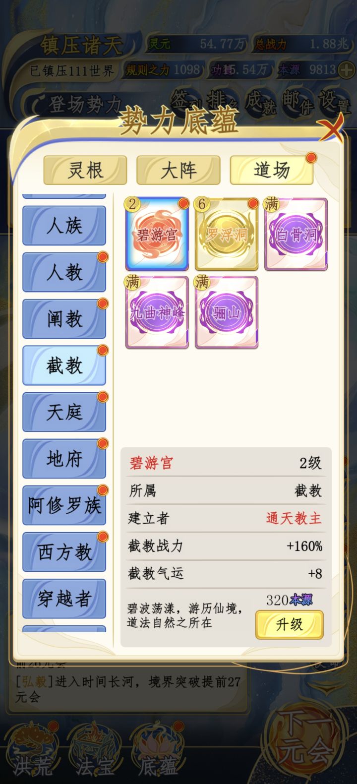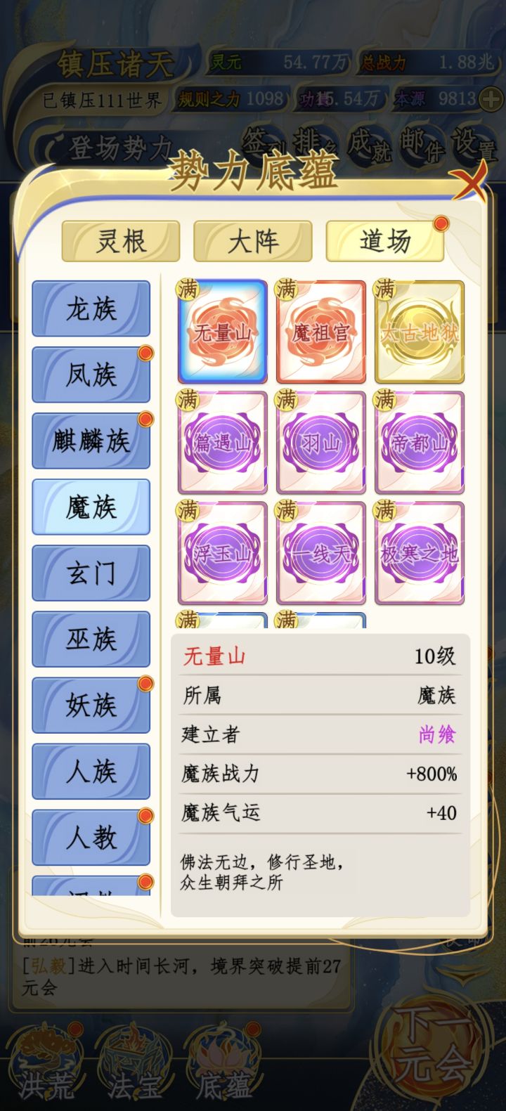 看了其他道友的截图,才发现大家的道场数量有差别。就比如 我的魔族11个道场,2红1金6紫2蓝;玄门7道场,2红1金1紫3蓝。道场数量是不固定的,且道场名字也是随机的?欢迎各道友贴图对此。初步结论:部分重要角色的道场是固定的,部分角色的道场是随机的。灵根可以移植,道场却没的争夺,所以势力的战力几乎是设计时就定好的。灵根可以移植,法宝却不能转移。有些天命之人的法宝被强者抢了很难受哇。而且法宝
