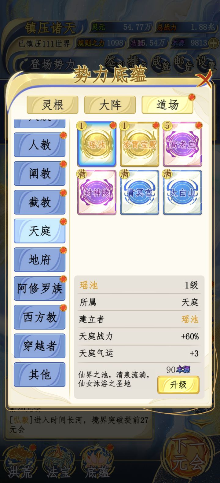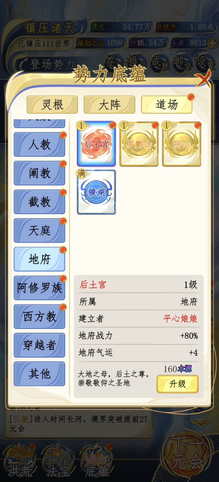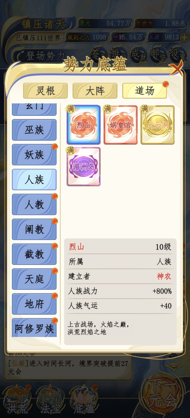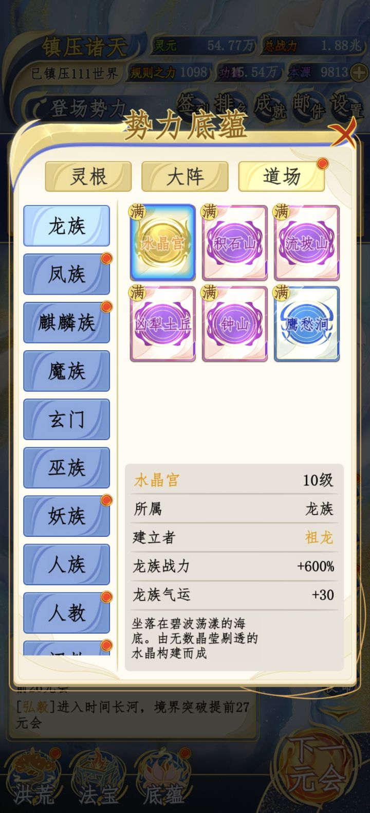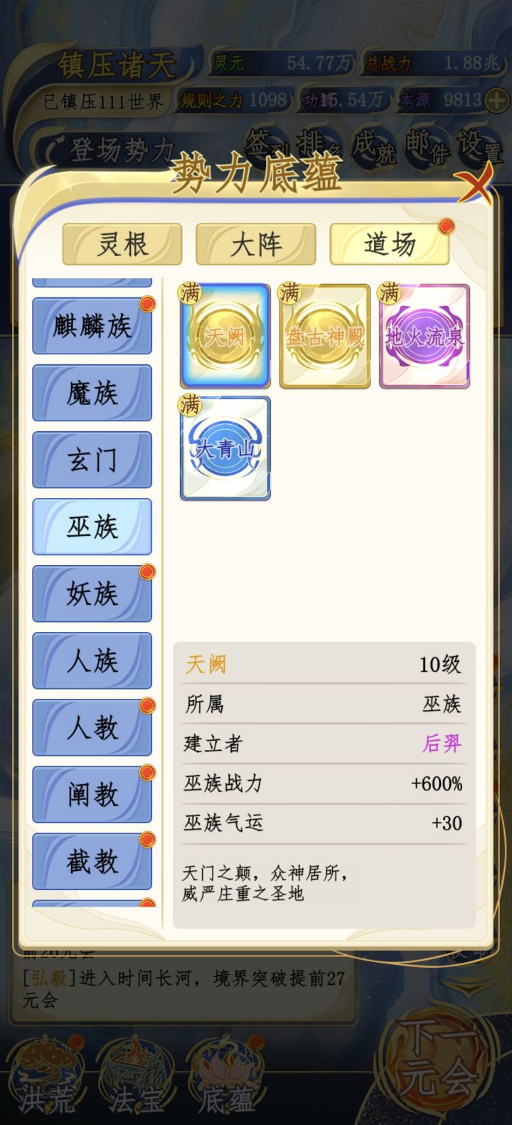 看了其他道友的截图,才发现大家的道场数量有差别。就比如 我的魔族11个道场,2红1金6紫2蓝;玄门7道场,2红1金1紫3蓝。道场数量是不固定的,且道场名字也是随机的?欢迎各道友贴图对此。初步结论:部分重要角色的道场是固定的,部分角色的道场是随机的。灵根可以移植,道场却没的争夺,所以势力的战力几乎是设计时就定好的。灵根可以移植,法宝却不能转移。有些天命之人的法宝被强者抢了很难受哇。而且法宝