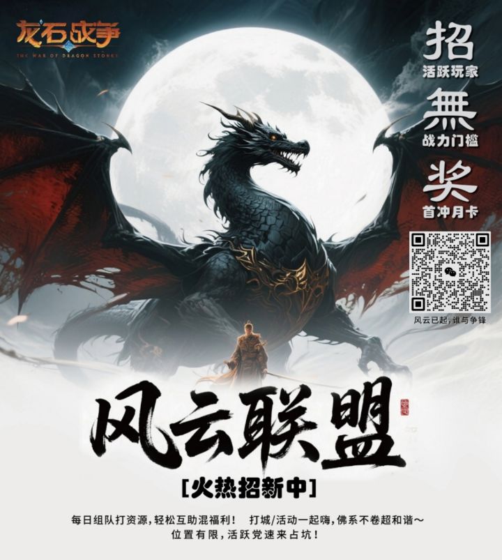 🔥【《龙石战争》招募令!寻找最强战友,共赴热血江湖!】🔥各位江湖豪杰、战场精英!《龙石战争》的烽火已燃,这片充满策略与热血的世界,急需志同道合的你加入!无论你是运筹帷幄的谋略家,还是冲锋陷阵的战斗狂人,这里都有属于你的舞台!🌟 我们需要这样的你:✅ 热衷策略对战,对《龙石战争》玩法有深度理解或浓厚兴趣✅ 拥有团队协作精神,能与队友并肩作战、共商战术✅ 时间充裕,积极参与盟战、副本挑战等活动✅