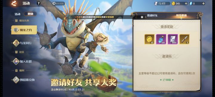 (一)兑换码:RITA626LSZB626LSZBZGLBLSZZHYZBTTUN626 (二) 邀请码:点击右上角活动-激励-驯龙之约,填邀请码:498301806353,拿海量奖励。