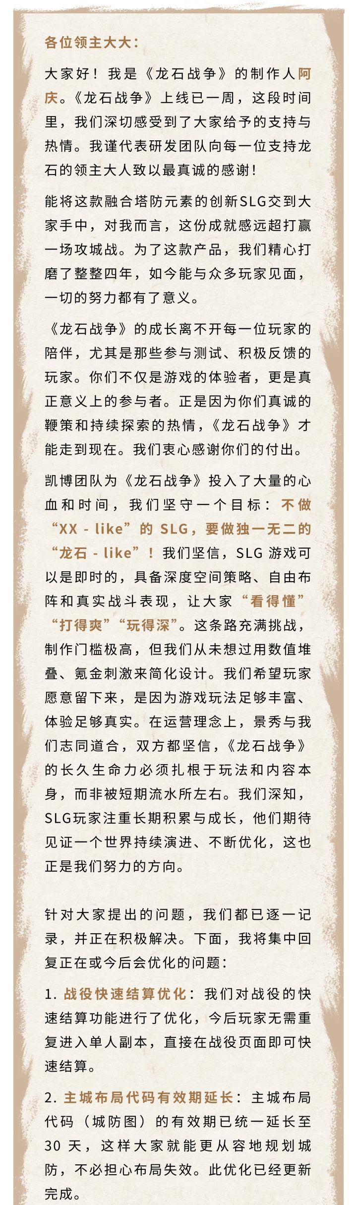 只做龙石like!制作人写信亲自讲述未来版本规划