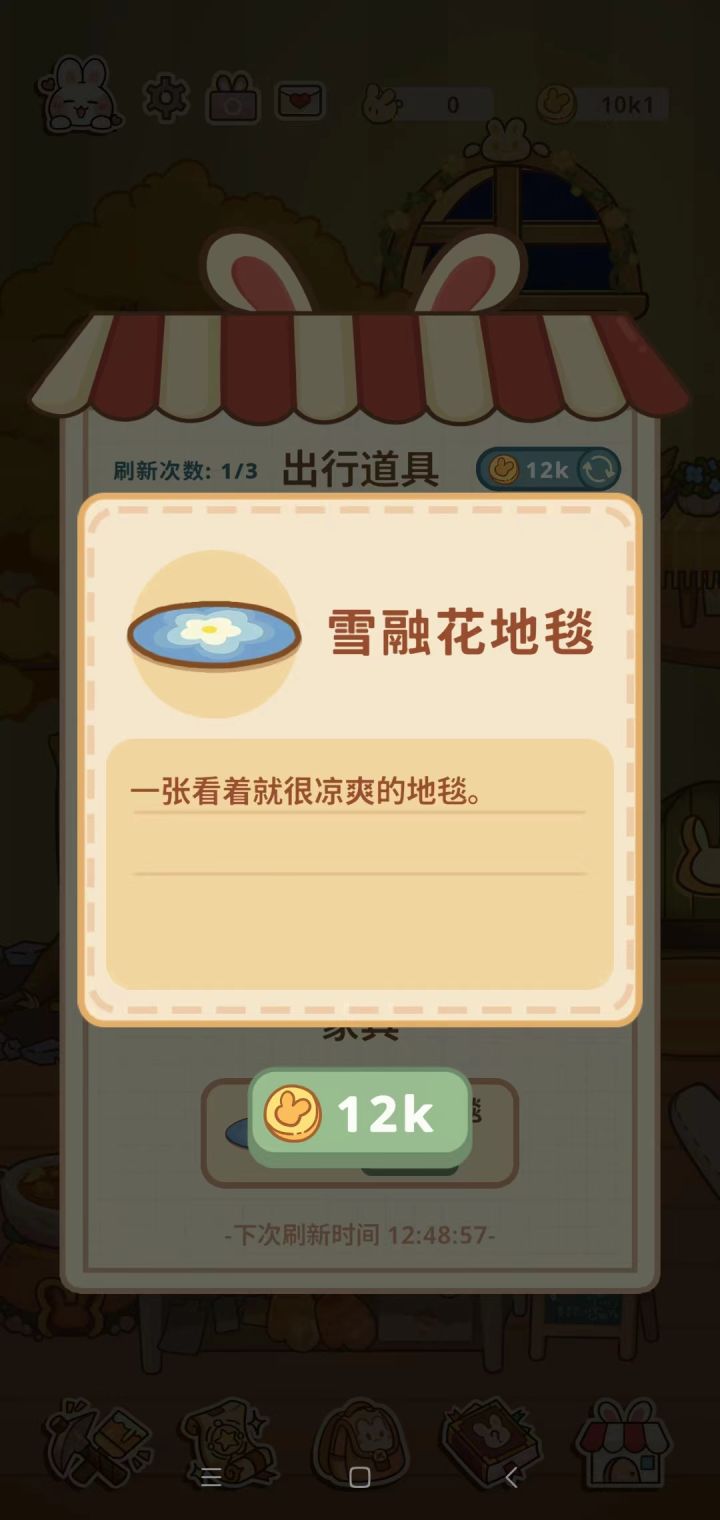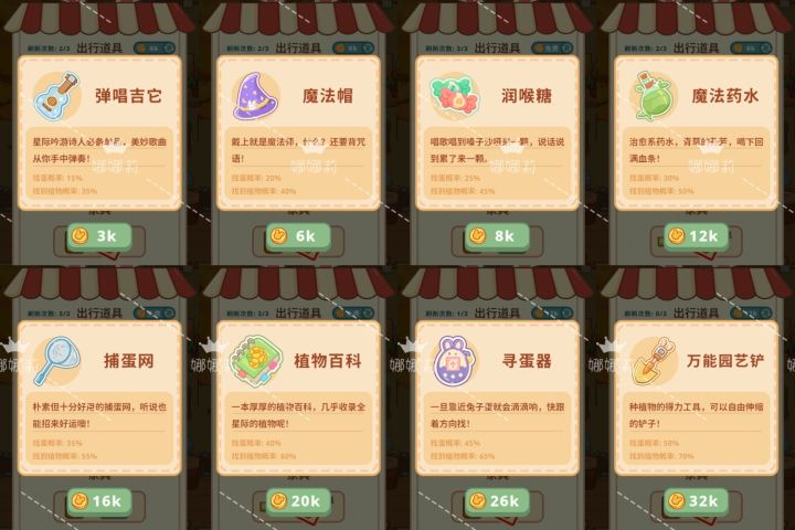 rt,文字放前面,图片放后面,方便看一点,图片顺序是按价格,一般价格越贵的,效果越好。前期兔子少钱少的时候,尽量不要花钱刷新,就用免费的刷新就够了。后期兔子多钱多的时候,要刷新把道具大部分都买了,但不要买前二价格的道具,浪费钱,一开始没钱的时候不能刷新买着过渡用能出门就行,后期就别浪费钱买垃圾了,那钱直接刷新就行(之前说不要买便宜的那两个道具,但是我实际测试了一下,不知道是出了bug还是什么原因