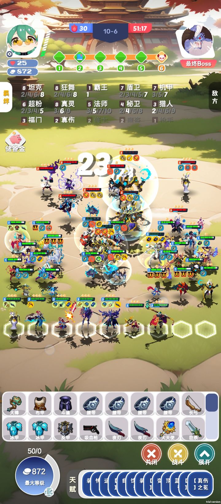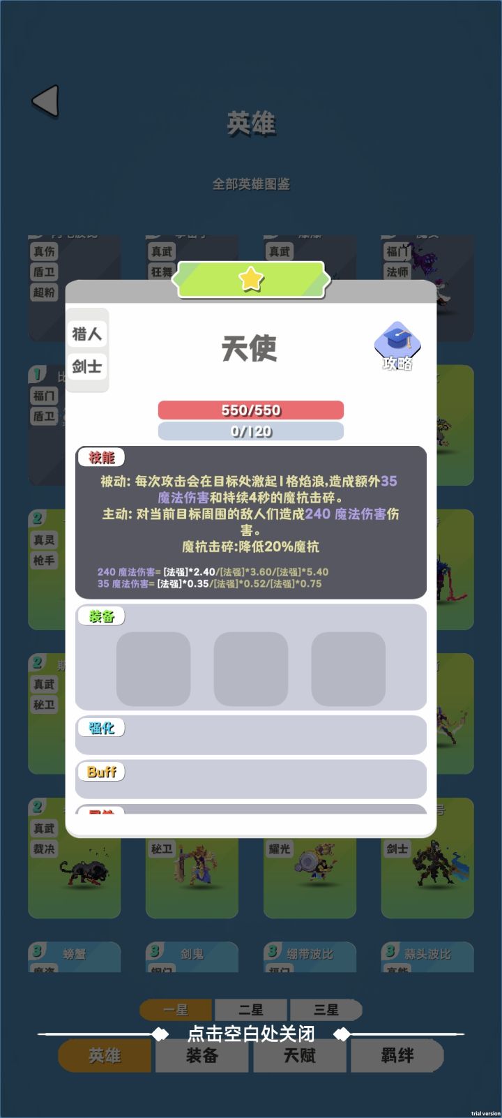 常规套路都是钢门福门前期搞资源,中期堆血量机甲,后期堆人口凑5费3星凑各种羁绊,掘墓狗头大虫真的有点腻了。在打通了无数次之后,我就在想,不堆血量和盾,直接暴力输出有没有搞头呢?于是,剑豪和天使这俩货的羁绊和技能引起了我的注意。剑豪,1费,成长型,有续航,有单杀,有控制。天使,2费,群攻型,有Debuff。于是!围绕真伤猎人剑士的疯狂输出战术来了!前期5费出来之前,优先真伤,有猎人就存着