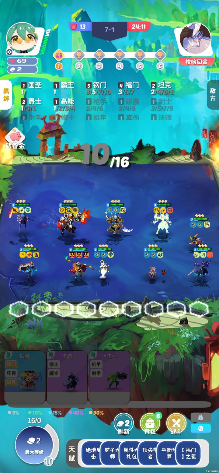 方法一:传说之力-装备重随选择装备重随开局,2-1的时候就可以选文章书抽福,抽不到也没关系。后台关闭重启大法,可以读档3次,cd10分钟。进来再刷一遍。如果还是没有福就丢包里随机。之后选传说之力可以优先选牌子丢包里随机。优先7福容易得锅勺铲,运气好打完4层就能筹齐7福10钢。关于升福门人口而棋子强度不够的问题,1.二星波比本比装备饮血剑、水银、1防具随便选,如获得强化饮血剑可以不用防具,站位