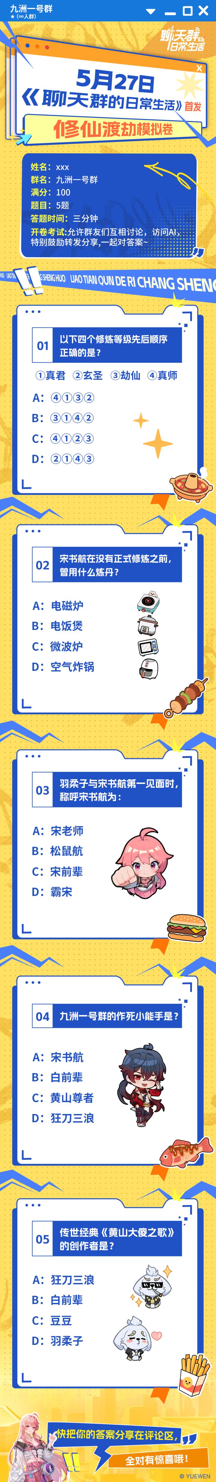 各位群友们,各位群友们!《聊天群的日常生活》即将要首发啦!就在5月27日!就可以正式下载玩起来啦~众所周知,周所众知,《聊天群的日常生活》是由阅文集团经典网文《修真聊天群》正版授权改编,因此游戏里也有非常多原著小说的剧情和梗,比如大家最爱的飞剑限行、九洲一号群等等等等。那么你对《修真聊天群》有多了解呢?鸡毛菜今天特别准备了一套题目!各位群友可以试着来答答看,鸡毛菜会在首发当天抽出全部答对的3