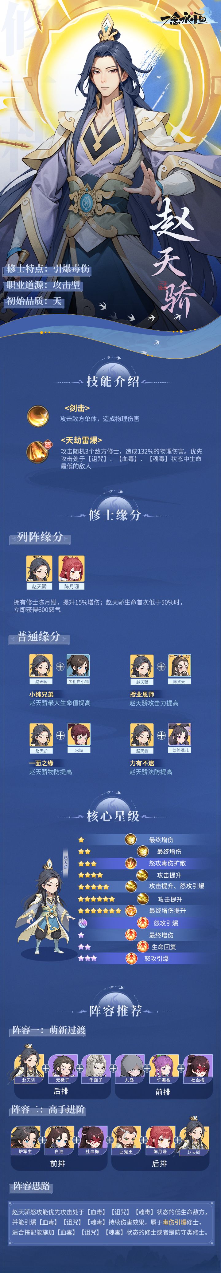 第三季新修士「天品·赵天骄」已上线!开服15天后的天骄可通过【龟纹炼灵】活动获取,相关资料攻略龟爷也一一搬上来▌赵天骄游戏定位是引爆毒伤、毒伤复制,怒攻会随机攻击3个地方修士,造成132%的物理伤害,优先攻击处于【诅咒】【血毒】【魂毒】状态中生命最低的敌人。修士三星后普攻会复制目标身上的一个持续伤害效果,修士五星后怒攻可引爆目标身上持续伤害效果,立即造成效果剩余伤害,神话级别时可