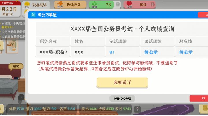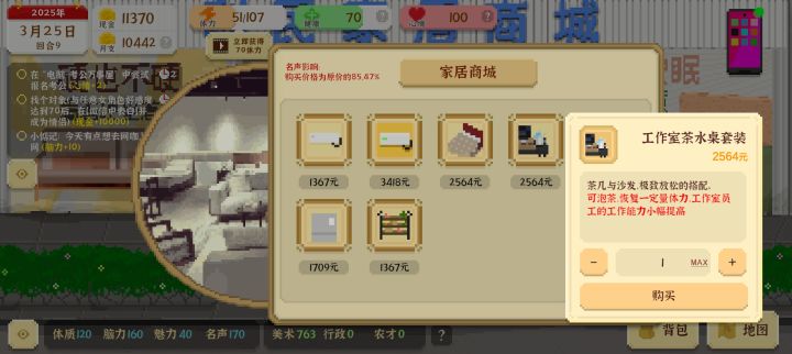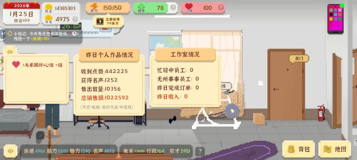 第一个月美术,第二个月种田,第三个月考公上岸,不买彩票不看广告,30回合即可搞定80万房车。本攻略表白艾薇,也可以分配资源在同一时间拉小花好感到70首先,每回合都要获取完大地图上所有的额外体力:外卖奶茶+撸猫+零食+双杠+椅子+可乐+公司茶水+上网共计73–103点体力,吃饭可以有36-55点体力。一天极限可以拿到150+103+55=308点,完全够刨四块地+指点八个员工+聊三个人+全图救