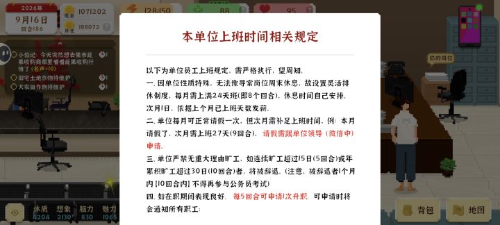 一开始我选一开始我选择了提高自己的设计能力和慢慢种田,任务有些我没做。不过我坚持每天,在体育馆和学校进行活动,体育馆三千米可以提高体力上限,摸猫猫可以提高你的活力,但也容易被抓,学校有板凳坐着休息还有抬杠也可以休息,后面有一些钱了,可以先开设计工作室,把前同事拿过来,就开始慢慢赚钱了,等你有钱了,你就可以把大农场开启,再去找亲戚来帮忙,你就可以完全过着每天有钱的生活了,这时候你可以开启你的考公生涯