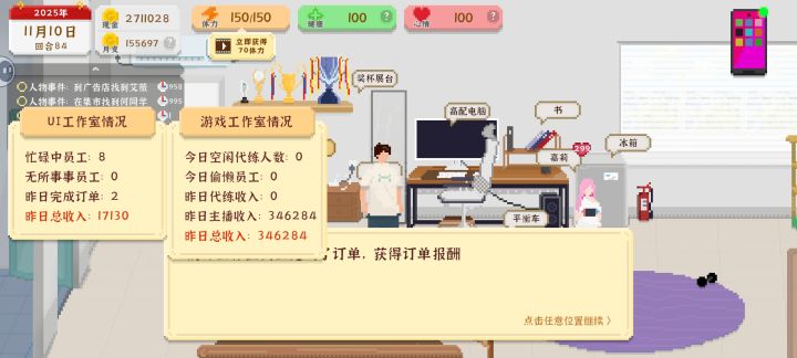 之前按照旧版本的思路来进行游戏走了太多弯路,游戏工作室的更新使得每回合金钱收益来到新高出来先开电脑写一个500分的ui,写完之后直接睡觉到第二天开始设计角接单随便接个单,接完就开始画,画到双属性到了60就睡觉,有328就吃,没有就不吃之后就是第一笔钱到账后去pdd买一个锻练身体的单车买完就可以开始第一阶段了这个阶段每天