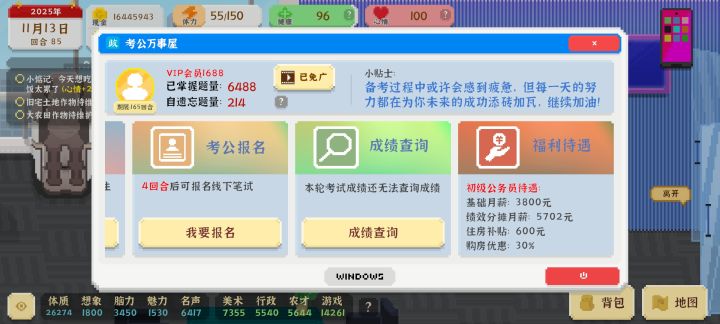 想考公务员前期刷题3000行政1000回合数越高所需数值越高刷题对应的应该是笔试行政对应的应该是面试考上之后分三级公务员每5个回合会有一次升职称根据你的名声,魅力,行政,干过的顶目等等决定升职概率考进时为低级购房有30%补贴底薪:3800住房补贴:600升值后为中级公务员购房有45%的补贴底薪:5700住房补贴:800再升级作为高级公务员购房有60%补贴底