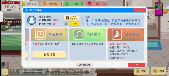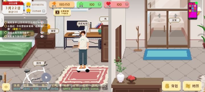超棒的一款模拟人生游戏,好久没有熬夜沉浸式玩游戏了。虽然后期没有太多可探索的,但是前期慢慢成就的过程很爽。玩了20多个小时😂😂昼夜不分的玩啊,本来不想结局,但是又想玩前期打工的过程。如果可以存档就好了。不知道作者还继续做这个游戏不,做的话,有没有主女版