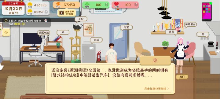 有点不耐玩啊,玩到没经济压力、买房同居之后就没方向了。还有建议和女孩的对话多点内容,不然没聊几次就发现都是重复的都没聊的欲望了,最好话题可以循序渐进的那种,至少表白后和对象的对话要升级下吧,要不了多少工作量吧。大家觉得呢。