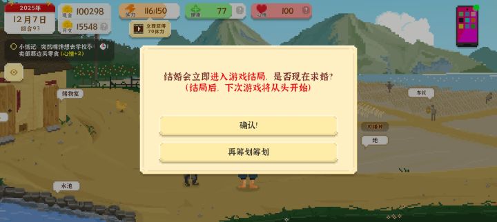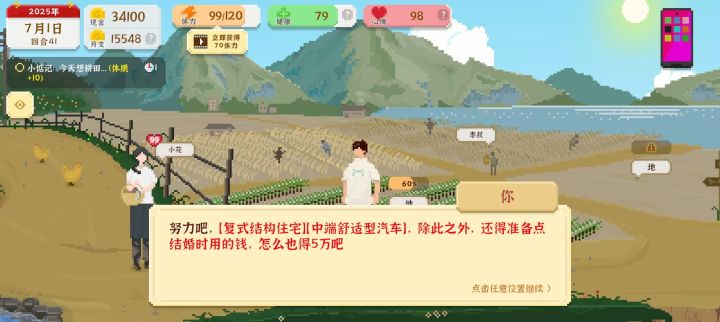 首先说一下,我是一开始种地然后发现赚不了多少钱我就去专门搞设计接单,省吃俭用攒下一万之后买写字楼招了八个初级牛马,一步步指导成高级牛马,然后考公上岸,赚到50w,(考公买房买车会优惠好几个w)自己买房买车娶小花。(因为前面表哥借钱、谈女朋友奖励1w、还钱我都没完成,只能靠自己的 然后是我的一点点小看法: ①问题:到中期,开工作室之后我的体力没处花,因为小花好感99,体力达到最大上限150,不愁