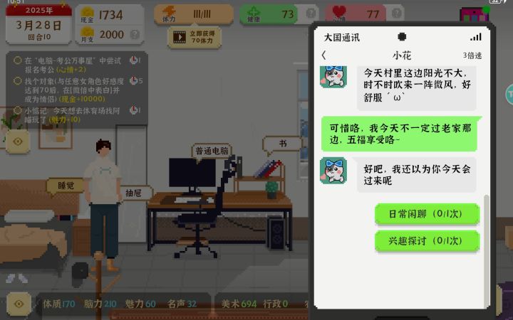 玩到后面刷钱就很容易了我的钱其实足够结婚,也足够支持小何同学,但是只能选择一个结局然后我买了复式别墅也没能看见它是啥样的qwq好难过另外聊天可以在再优化一下,恋爱角色的聊天内容重复率太高了,搞得我后面基本不对恋人抱有兴趣,而且后面好想跟老妈说话,但是老妈都不怎么发信息了还有约会内容也是,可以多写一些恋爱内容。感觉恋爱好感加到百分之九九之后,跟这个恋人能经历的都经历了,就没什么有效内容了#我