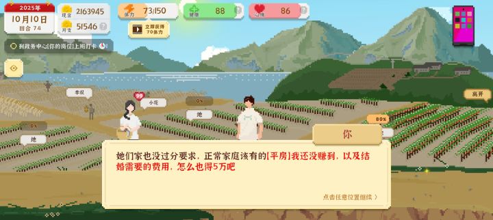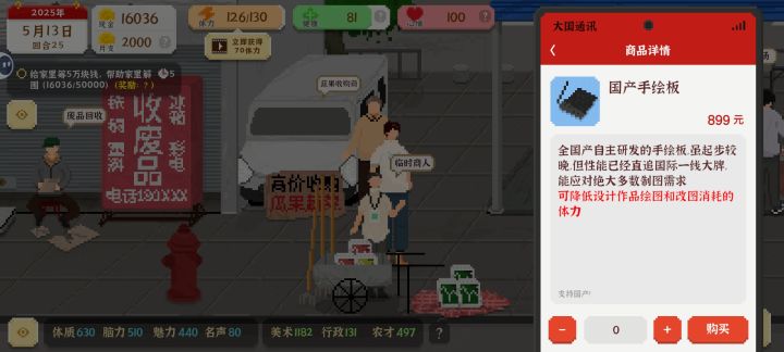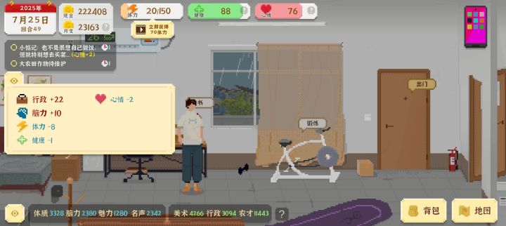 1.看书 加行政的那本书有一个没有感悟(疑惑)可能是显示错误吗?2.公务员工作一个月里我8个回合都上班,突发奇想请假了一天(我请假是在上班之后的),然后第二个月我上完班了还记我一个旷工(黑人问号❔)3.旧宅那边承包的小土地没法退租4.网咖那里点击少女的名称没有出现可以花费体力的活动,要点击大概少女的电脑附近才行。网咖其他人物可以建议 1.增加体质、脑力、魅力,特别是名声的获取途径。 我自己
