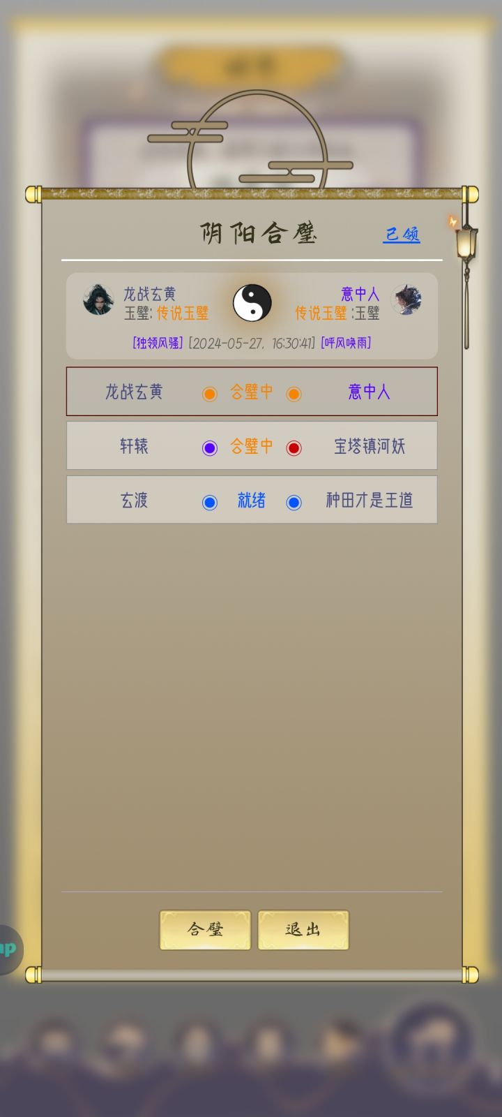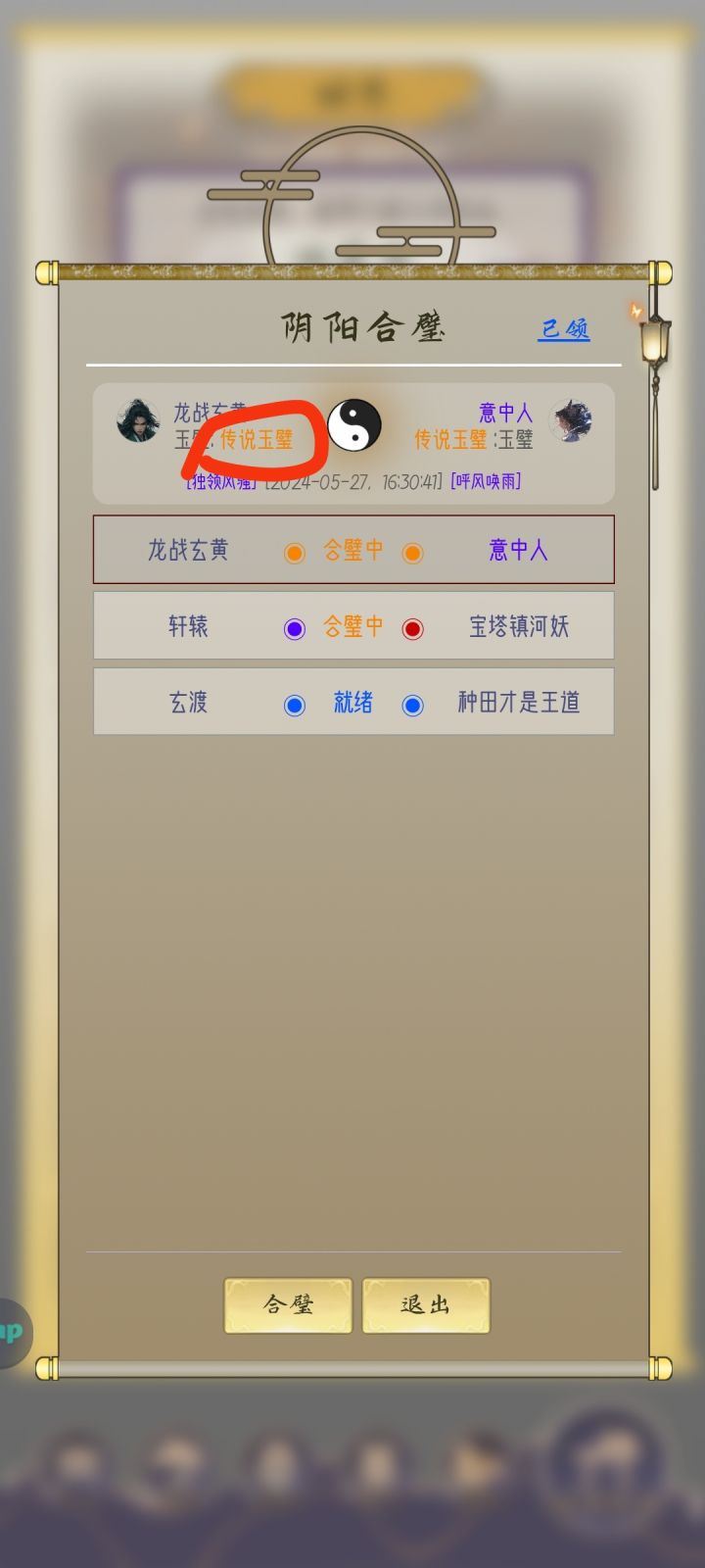 这个玩法个人觉得是比较有趣的首先每天可以领一次玉璧,一次有两块,品质完全随机进入阴阳合璧玩法后创建房间,可以拉上你的好兄弟或者发送邀请等其他道友加入,然后双方各自选择玉璧,图二圈起来的地方,然后进入到15分钟的合璧阶段,这个阶段会被其他玩家争夺,房主和争夺者发生战斗,胜利就继续合璧,失败会按比例扣除奖励(仙玉)给争夺者。如果品质是相同的两块玉璧,还会获得额外奖励,这个奖励不会被争夺损失掉。还