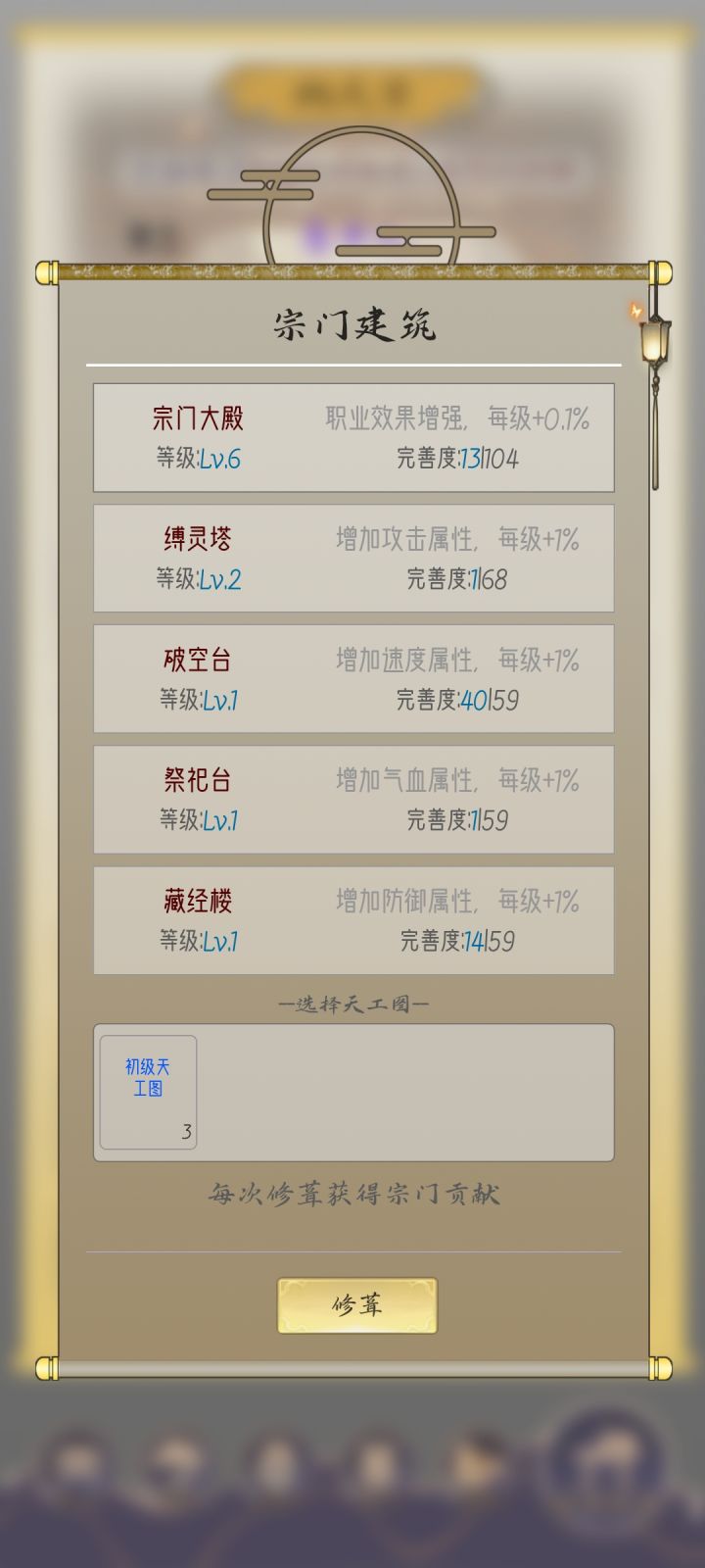 心经4小时一次领悟,和藏宝阁不一样,藏宝阁有晚11早8的限制,宗门心经则是全天开放,每次领悟有50%概率获得宗门贡献,同时会强化随机一条属性,达到强度上限就会自动升级建筑需要用天工图去修葺,天工图可以签到获得,未来也许会在副本中开放获得,天工图有四种品质,稀有,史诗,传说,绝世,如果要修葺宗门大殿,需要用史诗级医以上包括史诗级天工图才能修葺,每次修葺根据品质不同获得1/2/3/4宗门贡献,以及1