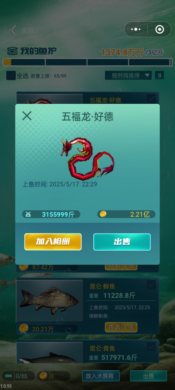我掉起来的一条昆仑·螭吻,重2160168.57斤。