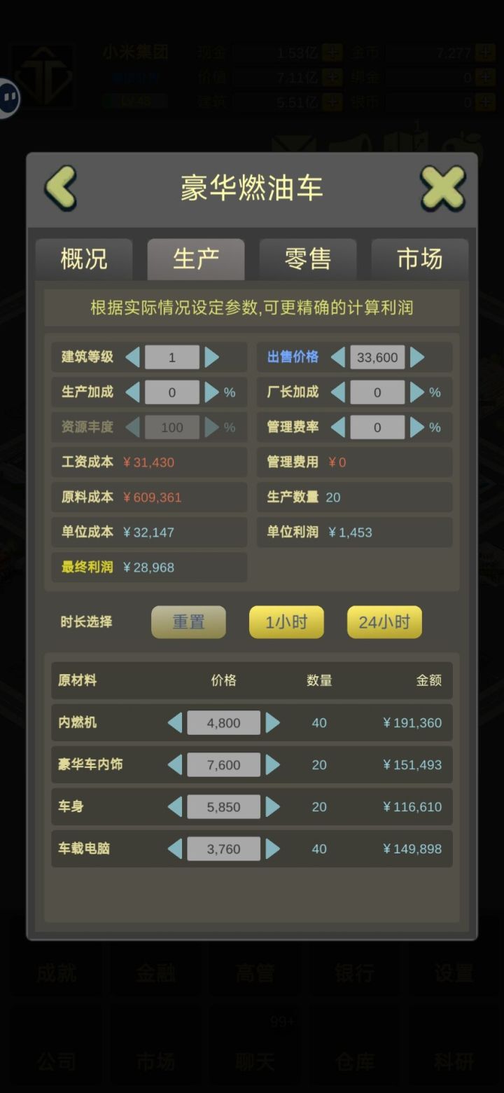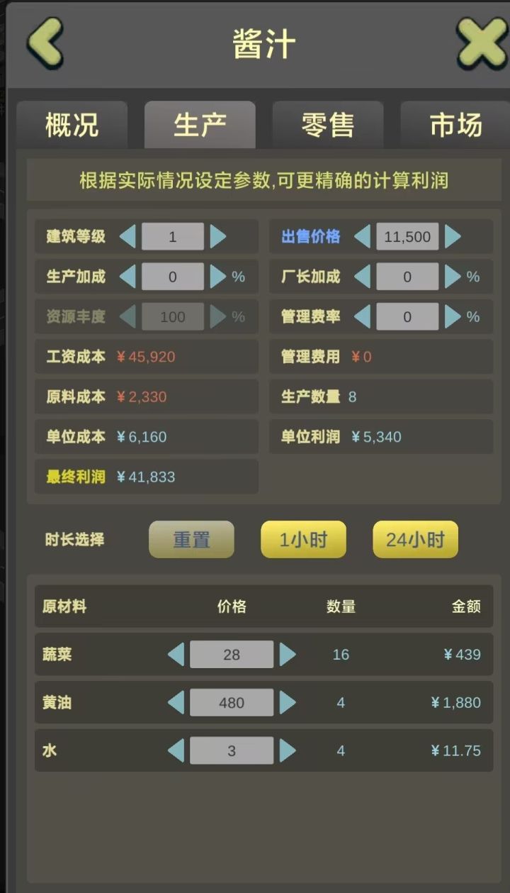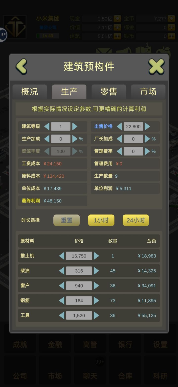 玩法:纯生产,纯零售,自产自销(生产+零售)(不要听其他人建议去某个行业)(有问题可以问官方群的管理员)新人必学【每个行业都有行业的最高利润上限】(建筑成本高相应的部分行业上限高)新人特权:1.35级以前有无限供货系统(比市场均价高一个价位无限供货)2. 2级以下建筑拆除时没有损耗一.行业利润计算器(以生产为例)原材料价格+员工工资+管理费=成本生产加成(总监)+厂长加成(