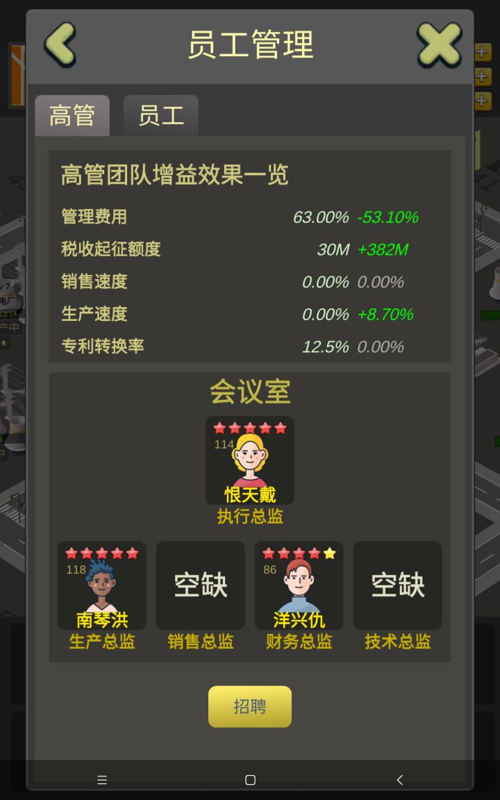 新手刚进的时候一定要完成新手任务,否则会很亏的。新手前期尽量自产自销,不会让人卡脖子。做完任务后,看个广告,拿到1千金币。然后拿800金币去租8块地。现在就有十来块地了,地越多升级也就越快。每天5000万贷款尽量拿到,不要去还贷款,凭本事借的钱还啥,那点利息毛毛雨。招3个高管,一个管理,一个生产,一个零售。当你管理费超过15%的时候就要准备建管理中心了。前期2级管理中心就够用了,后面到30级就要准