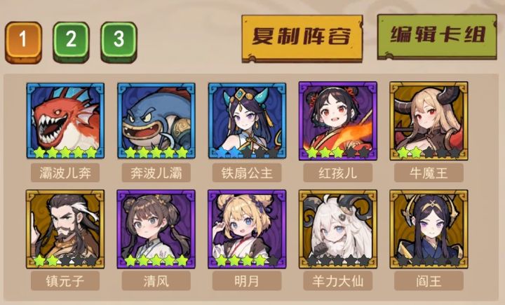 如果卡牌等级底,但是还是想通关无尽模式的话,那么就需要亿点点的运气了首先,依然选择猴子主c的这一套伤害流派阵容代码:[16,17,24,27,25,26,12,9,21,13]但是介于等级底,你必须能做到:开局开出强力支援Ⅲ,取得红孩儿和铁扇公主,这样可以开出一家三口 - 百分比aoe真伤和扣血对后期的高血量怪物海很有效开出奇能异术给青牛精 - 否则从150波开始的螃蟹海能把你控到死开