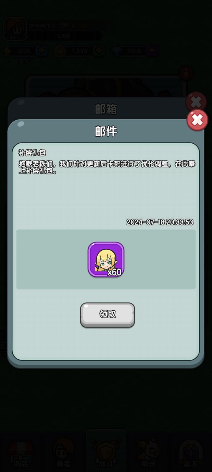 没有更新的情况下看到有邮件,领取后没有到账,出去更新后也没有,导致我精灵现在只有2星
