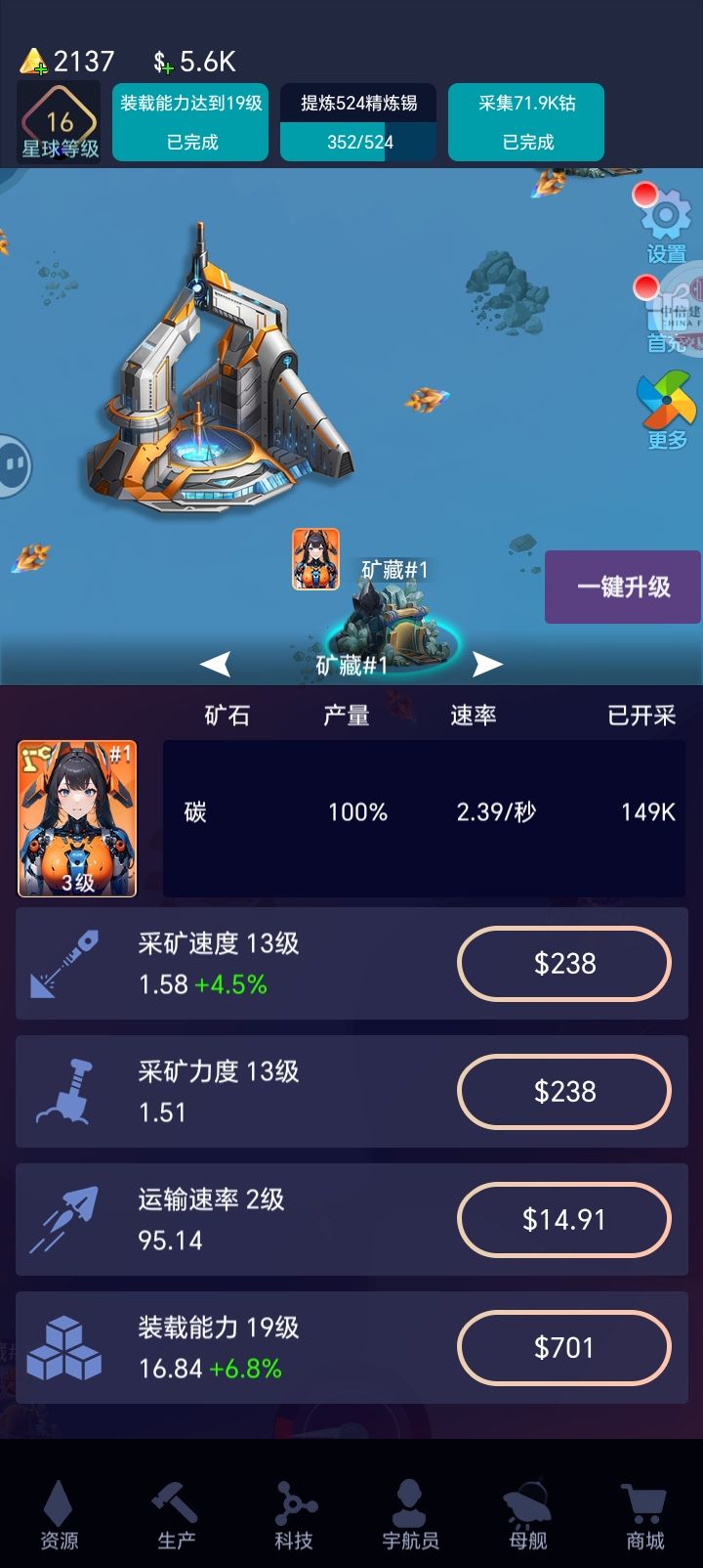 采矿速度和采矿力度的等级提升速率,就是每秒开采量。运输速度和装载能力是把已开采下面的数量给运到母舰。已开采下面的数值是矿藏开采出的量,在矿藏里还没运到母舰。个人理解,欢迎大家指正。