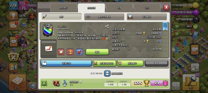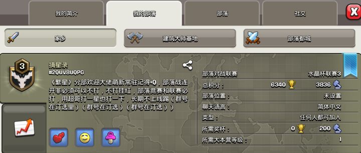 本部落适合游戏时间不充裕,喜欢躺王的打工仔们,部落联赛可以躺5王用超哥偷本,部落都城随意打,部落竞赛必须打,能打满尽量打满,目前本部落在建设中,若表现活跃可以与首领协商进入主部落!#2QUV8UQPG