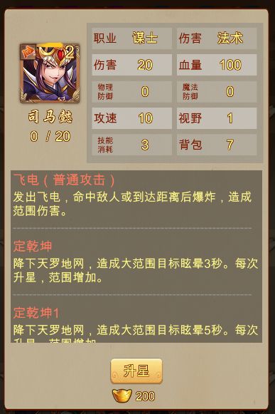 天罗地网定乾坤——谋士纯控制系职业普通攻击为投掷类型的小范围魔法攻击,注意是魔法伤害类型的范围攻击哟~可以有效针对物理防御极高的BOSS怪物后期对大波的怪物也能打出极佳的DPS唯一缺点是子弹飞的太慢,可能丢失掉速度极快的飞贼怪技能为大范围控制,为目前眩晕时长最大的职业每次升星可以提升眩晕时长和技能攻击范围投放司马懿(群雄)金色贾诩(曹魏)红色搭配职业飞将、战士等放置在