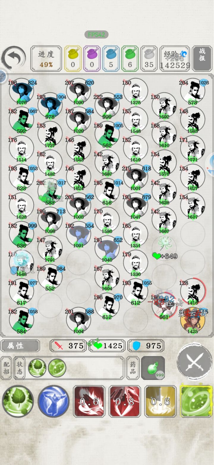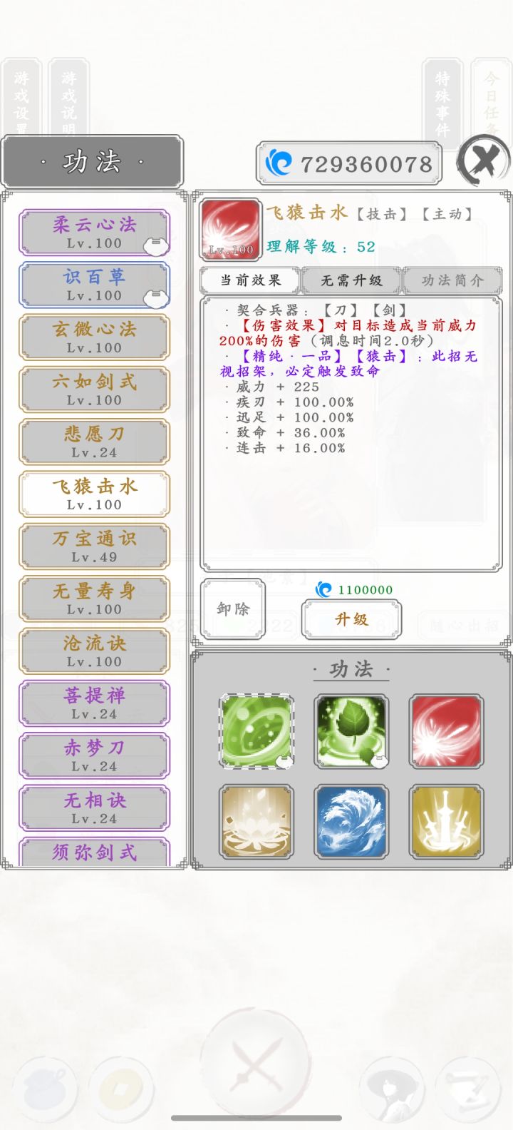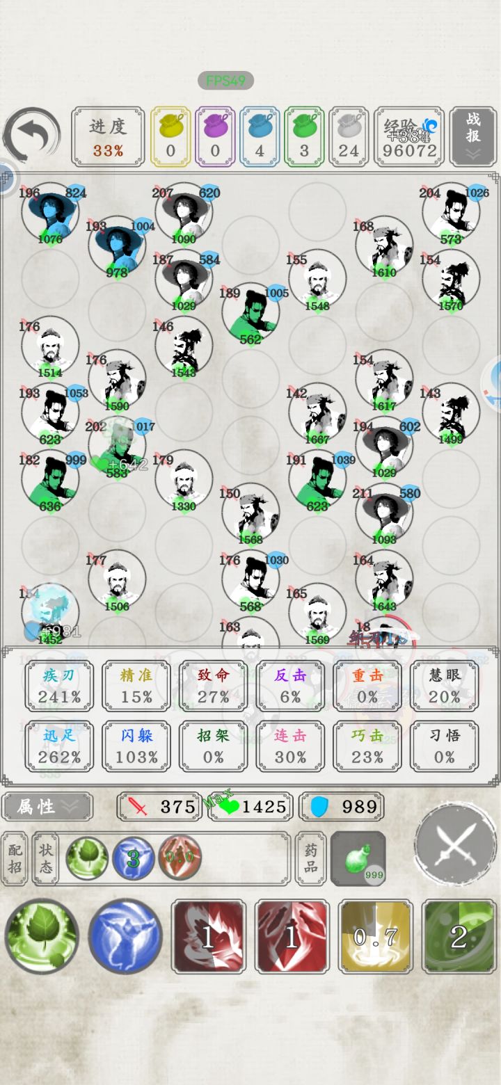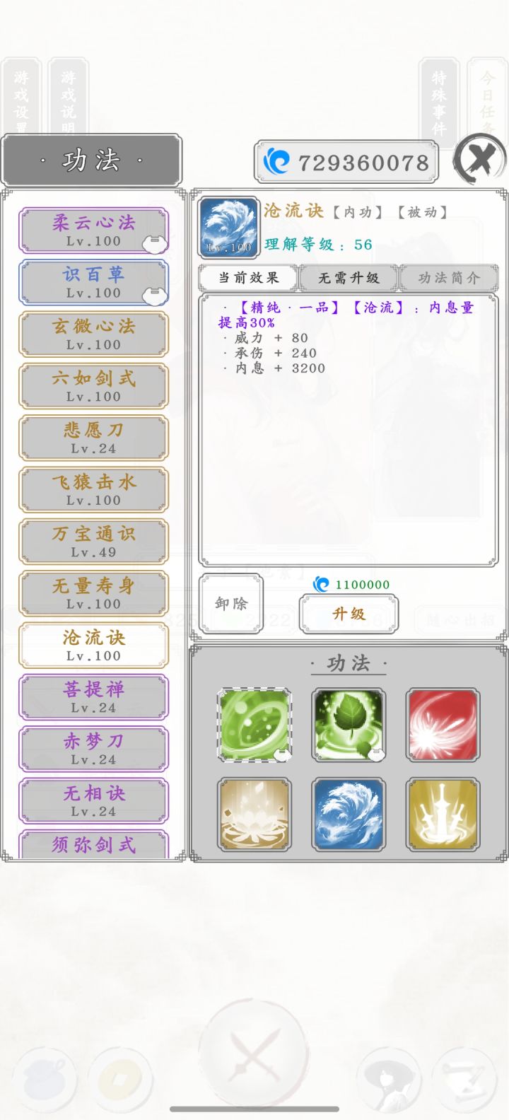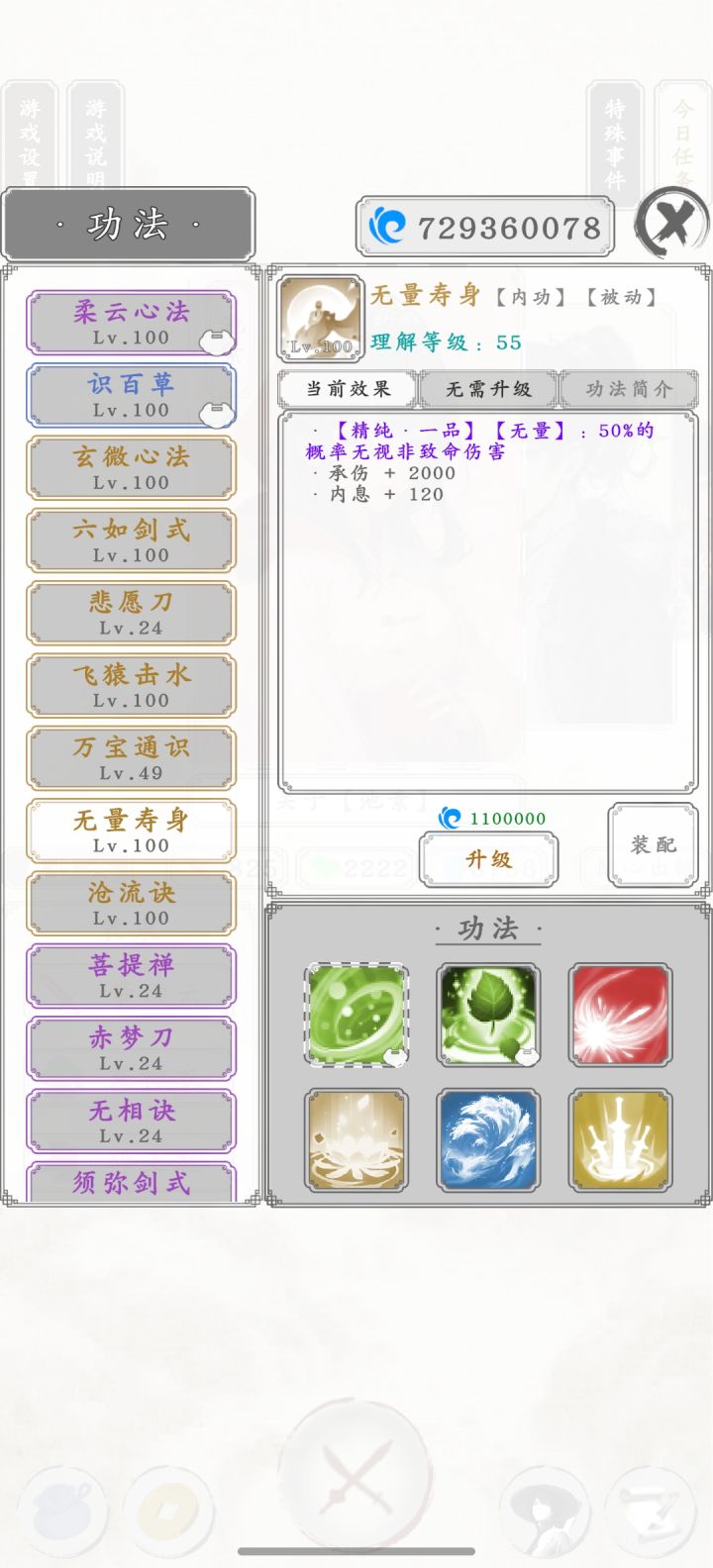 图一就是点击阅读书信后弹出来的,读信读的差点就绝望了,这爆率真感人,大概读了将近两千封信。 关于该人物战力后面再研究。 池素已经无敌,99层无伤通关。 两个金色被动功法,两个金色主动战技,八千多内息,免疫内息百分之五伤害,大概五百以内的攻击都是无效的。 再加上50%概率免疫非致命伤。 战技还能回复等额伤害量内息,大概打出一千五伤害,也就是每击都会返回1500内息。 还有疾刃连击迅足致命