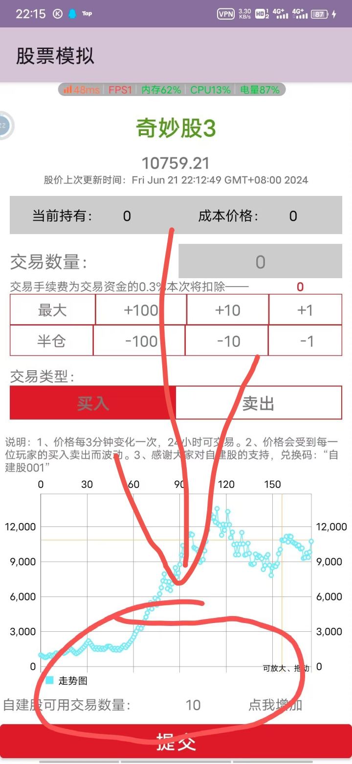 ①关于游戏:游戏的股票与真实股市数据一样,且实时更新。特点:可以T+0买卖不受限制。开盘时间:A股9:15~11:30,13:00~15:00 港股9:00~12:00,13:00~16:10建议点击试玩下载。如果直接用tap play可能会有很多bug。如果有bug可以加Q群反馈:372112484(没bug也可以进来聊天)②关于手续费:手续费小于0.01不会扣,手续费计算小数点第三
