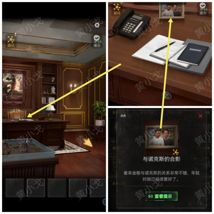 ||||||||第四章1.(金骰办公室)点击桌子上的合影,解锁线索(与诺克斯的合影)2.点击播放电话录音,解锁线索(与诺克斯的通话)3.点击桌子的抽屉,根据三个场景骰子装饰的颜色及上面的点数,解开密码锁(金-6、银-4、铜-1)4.打开抽屉,点击《成功学》,解锁线索(成功学书籍)5.点击信件,解锁线索(大老板是高官)6.点击查看墙上的画(注意画框的颜色及人物眼睛朝向:红左),