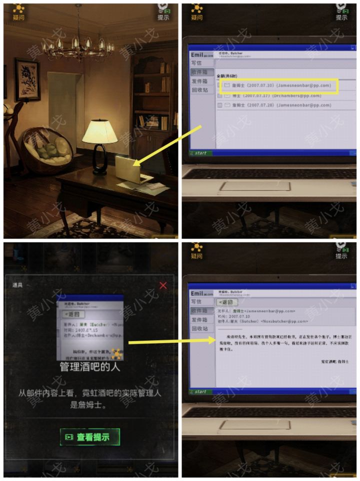 ||||||||第四章1.(诺克斯别墅二楼书房)点击桌子上的电脑,查看詹姆士7月10日发给诺克斯的邮件,解锁线索(管理酒吧的人)2.查看詹姆士7月28日发给诺克斯的邮件,解锁线索(调查没有暴露)3.查看诺克斯7月3日发给蝰蛇的邮件,解锁线索(帮会不怕被调查)4.查看诺克斯7月15日发给蝰蛇的邮件,解锁线索(妹妹有关的时间)5.查看诺克斯7月29日发给蝰蛇的邮件,解锁线索(蝰蛇是