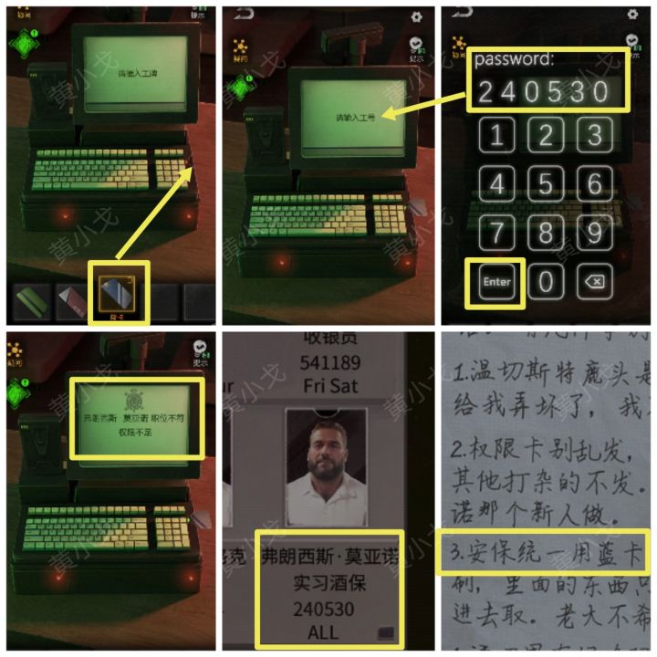 ||||||||第二章1.(酒吧大堂)点击收银机,插入【蓝卡】;根据值班表上的线索,输入莫亚诺的工号:240530(注意屏幕上的图案)2.插入【红卡】;根据办公室电脑上的线索,输入工号:6640123.打开收银柜,查看里面的物资采购单,解锁疑问(西部科技?)和线索(西部科技供酒单)(注意屏幕上的图案)4.(酒吧走廊)点击墙上的机关,根据上面的图案提示,结合收银机屏幕上的线索,调整