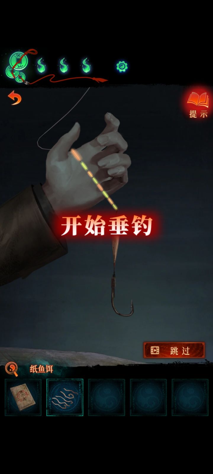 开局获得一根下下签根据天上飘的纸钱形状可知左侧标准的图案,拼完获得铜渔网将铜渔网放在桥上,获得一串花钱把一串花钱给八不郎,获得上上签把上上签给老道士,做小游戏,把白棋挪到白圆里,黑棋挪到黑圆里,做完获得戒尺用戒尺打扶门的手,打开大门,点击乌龟,获得平安符把平安符挂在红线左边,过剧情把下下签放进箱子里,灯笼亮,可以查看望远镜根据书和望远镜中的线索可知,敲鼓的顺序如图所示,敲完获得铜字