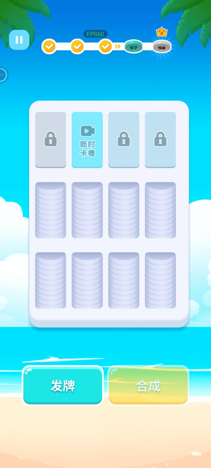 建议出个游戏金币和道具,让玩家除了看广告还有其他方式来洗牌是或解锁临时卡槽